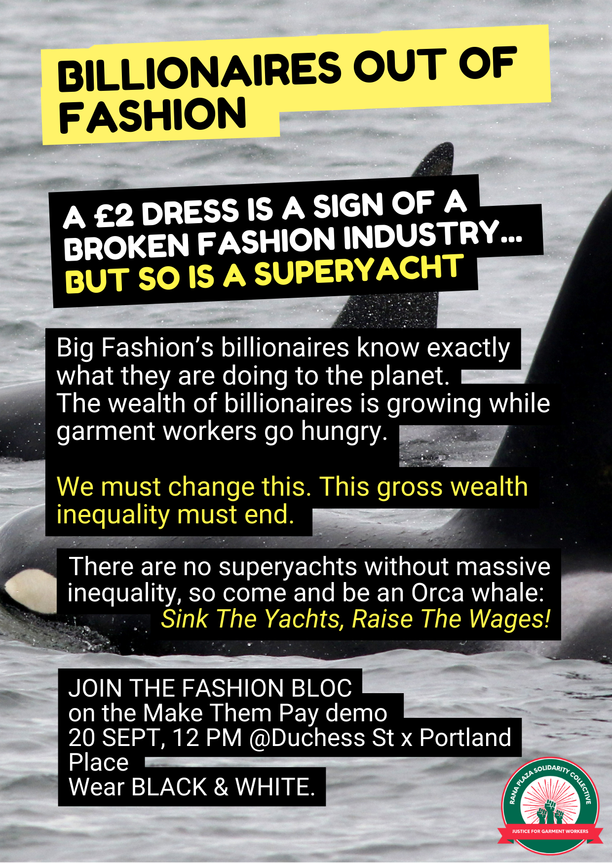 Because there are no superyachts without blinding inequality, because owning a superyacht is about the most harmful thing someone can do to the planet, and because Orca whales like flipping yachts over, we are teaming up with an entire pod of Orca whales to say Sink The Yachts, Raise The Wages!